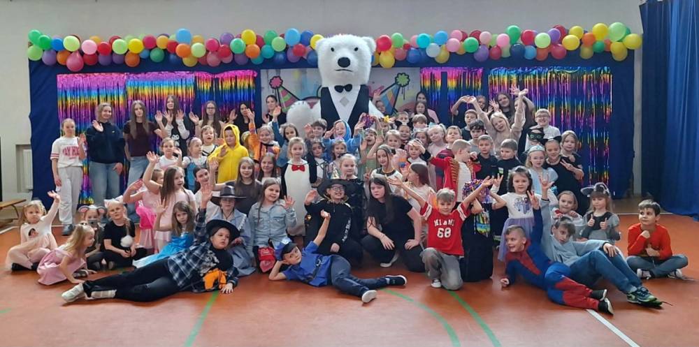 Szczególne podziękowania należą się uczniom klasy VIII, którzy wcielili się w rolę animatorów. Z ogromnym zaangażowaniem prowadzili zabawy i konkursy, wykazując się odpowiedzialnością, kreatywnością oraz troską o młodszych kolegów i koleżanki. Była to dla nich wspaniała lekcja integracji i współpracy. Niezapomnianą atrakcją balu okazała się zabawa z wielkim białym misiem, który wywołał mnóstwo uśmiechów i stał się bohaterem wielu pamiątkowych zdjęć.