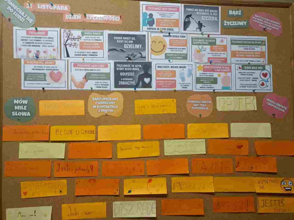 Uczniowie przez cały dzień dzielili się miłymi słowami, z których powstawały kolorowe „cegiełki życzliwości”. Dzięki nim stworzyliśmy piękną ścianę dobrych myśli, która będzie przypominać nam, jak ważne są życzliwość i wzajemny szacunek. Na korytarzach pojawiły się gazetki tematyczne, przygotowane przez uczniów i nauczycieli – pełne inspiracji, cytatów i pomysłów na dobre uczynki.